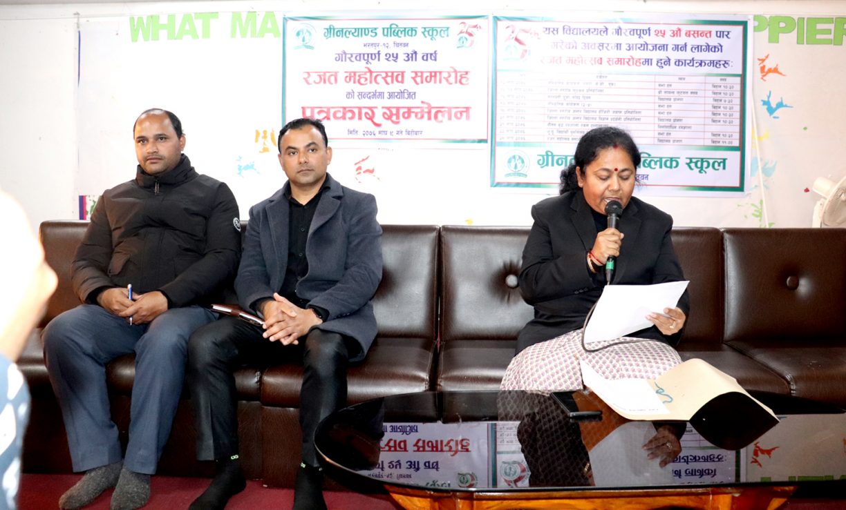 भरतपुर । ‘गुणस्तरीय शिक्षा हाम्रो प्रतिबद्धता’ भन्ने मूल नाराकासाथ २५औं वर्ष पार गरेको अवसरमा भरतपुर–१२ मा स्थित ग्रीन ल्याण्ड पब्लिक स्कुल भरतपुरले रजत वर्ष मनाउने तयारी गरेको छ । माघ १२ गतेबाट विभिन्न कार्यक्रमहरु गर्दै २४ गते समापन गरिने बिहीबार पत्रकार सम्मेलनमा विद्यालयका प्रधानाध्यापक इन्दिरा कार्कीले बताइन् ।