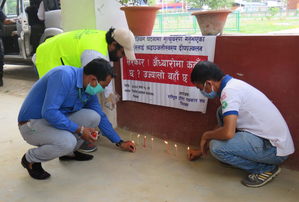 राष्ट्रिय दलित पत्रकार संघ केन्द्रको आह्वानमा जिल्ला शाखाले पनि सांकेतिक विरोध कार्यक्रम गरेको हो । सरकार ! अध्यारो कहाँ छ ? उज्यालो यहाँ छ भन्ने ब्यानरसहित राष्ट्रिय दलित पत्रकार संघ चितवनको टोली जिल्ला प्रशासन कार्यालय पुगेको थियो ।