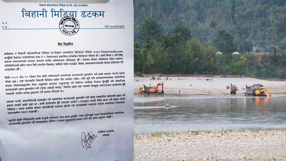 देवघाट / फेक आइडीबाट चरित्र हत्या गर्ने प्रयास गरेको भन्दै देवघाटबाट सञ्चालित बिहानी मिडिया डटकमले दोषीमाथि कारवाही गर्न माग गरेको छ। देवघाटमा नदीजन्य पदार्थ उत्खननको विषयमा समाचारजन्य सामग्री प्रकाशन तथा प्रसारण गर्दा आफ्नो गल्ती छोप्न बिहानी मिडियामाथि प्रहार गरेको आइतबार बिहानी मिडियाका अध्यक्ष आशिक रानाद्वारा जारी विज्ञप्तिमा भनिएको छ।