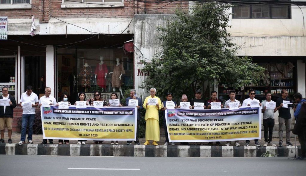 समाजले बुधवार काठमाडौँस्थित इजरायल दूतावास र इरानी वाणिज्य दूतावास अगाडी शान्तिको कामना गर्दै प्रदर्शन गरेको हो । मानवअधिकार तथा शान्ति समाजले सुरु गरेको युद्धका विरुद्धको अभियान स्वरूप प्रदर्शन गरिएको हो ।